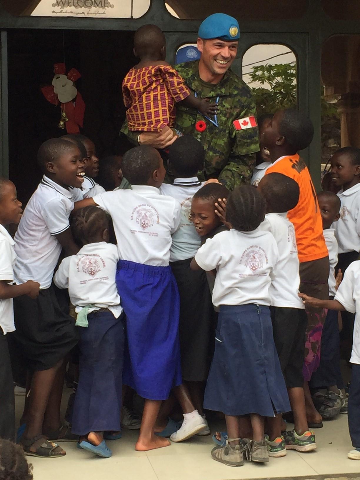 On this day, after the singing had settled down and the tour completed, the Operation CROCODILE Task Force Commander, Colonel Pierre "Pete" Huet, on behalf of a group of Canadian donors, and alongside the members of Operation CROCODILE, presented a large cheque donation of 2783 USD (4000 CAD before conversion) to the Tulizeni Orphanage to assist with the tuition expenses. The excitement of the kids and gratitude of the staff radiated and, not surprisingly, triggered the next round of singing and excitement. There was so much energy that the kids swarmed around Colonel Huet (pictured) and hilariously attempted to pick him up and put him on their shoulders to carry him around as they cheered. After the handshaking and the many gestures of thanks, they saw us off with big smiles and waves as we departed to get back to our primary task of combatting armed groups and protecting civilians in the DRC.